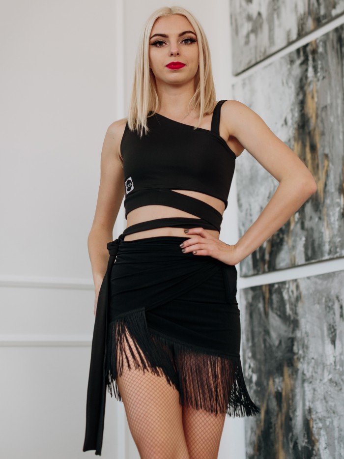 Он выполнен в асимметричном стиле с одним плечом. Передняя часть топа оборудована широкими перекрещивающимися лентами, которые подчеркивают талию и добавляют дополнительную поддержку. Эти ленты закрепляются на боку, создавая изящный акцент позволяя регулировать посадку по фигуре.